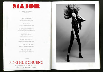 Ping Hue Cheung, who appeared in the recent issue of Vogue China (Feb 2010), must be hot property because she seems to be represented by two separate modeling agencies in NYC -- DNA (first image) and Major (second image). As of this afternoon, she is still on both agencies' website. Also she went from a size 32-24-34 to 34-24-34!!!